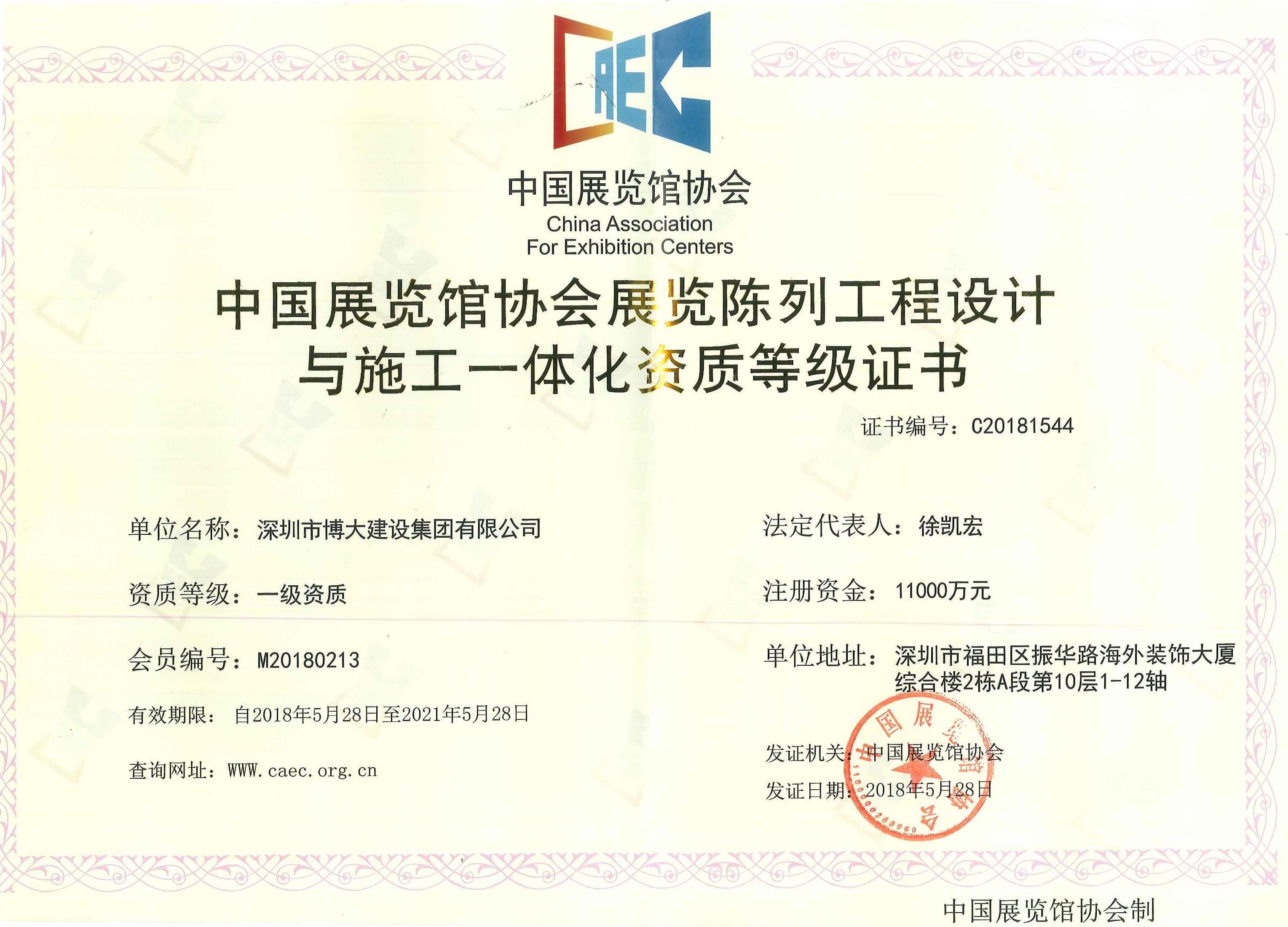 博大建設(shè)集團(tuán)作為行業(yè)最具發(fā)展活力的企業(yè),近年來以迅猛的成長速度,得到了越來越多的關(guān)注和認(rèn)可。在各級領(lǐng)導(dǎo)的關(guān)懷和全體家人的共同努力下,集團(tuán)資質(zhì)建設(shè)取得新的進(jìn)展:獲得展覽工程企業(yè)一級資質(zhì),展覽陳列工程設(shè)計與施工一體化一級資質(zhì)。