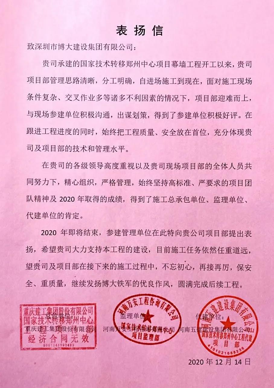 將履約視為生命!這是博大人的莊嚴(yán)承諾和工作準(zhǔn)則。12月14日,博大建設(shè)集團(tuán)國家技術(shù)鄭州轉(zhuǎn)移中心項(xiàng)目部憑借優(yōu)質(zhì)的履約能力贏得總包單位重慶建工集團(tuán)、代建單位河南五建建設(shè)集團(tuán)、監(jiān)理單位河南萬安工程咨詢公司等三方的高度認(rèn)可,并致集團(tuán)總部以表揚(yáng)信!