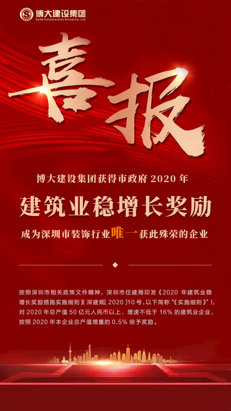 近日,從深圳市住房和建設局傳來喜訊,博大建設集團榮獲深圳市政府2020年建筑業(yè)穩(wěn)增長獎勵,博大是獲此殊榮的唯一一家裝飾企業(yè),當之無愧成為深圳市的行業(yè)龍頭,為行業(yè)爭光。